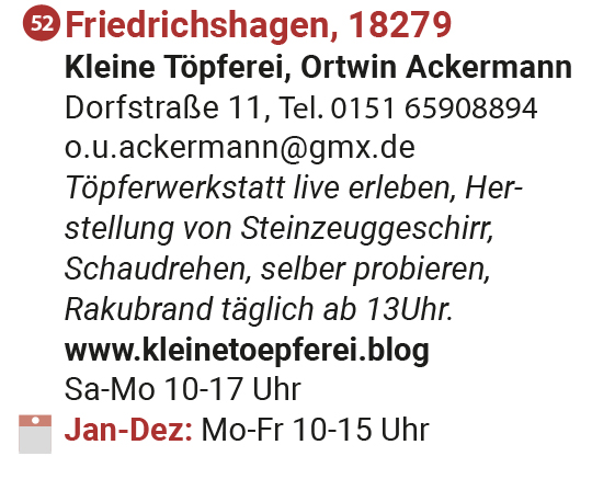 14.-15. März 2026…Friedrichshagen: Tage der offenen Töpferei: Einblicke in die Töpferwerkstatt, Schaudrehen an der Töpferscheibe, selber probieren; täaglich ab 13.00 Uhr Rakubrennen